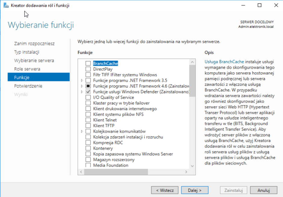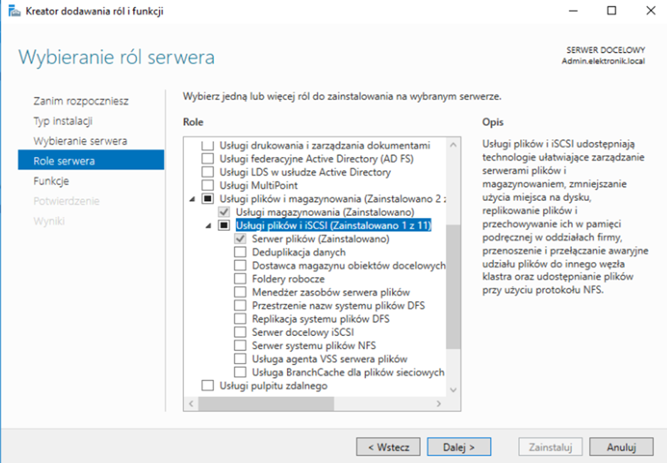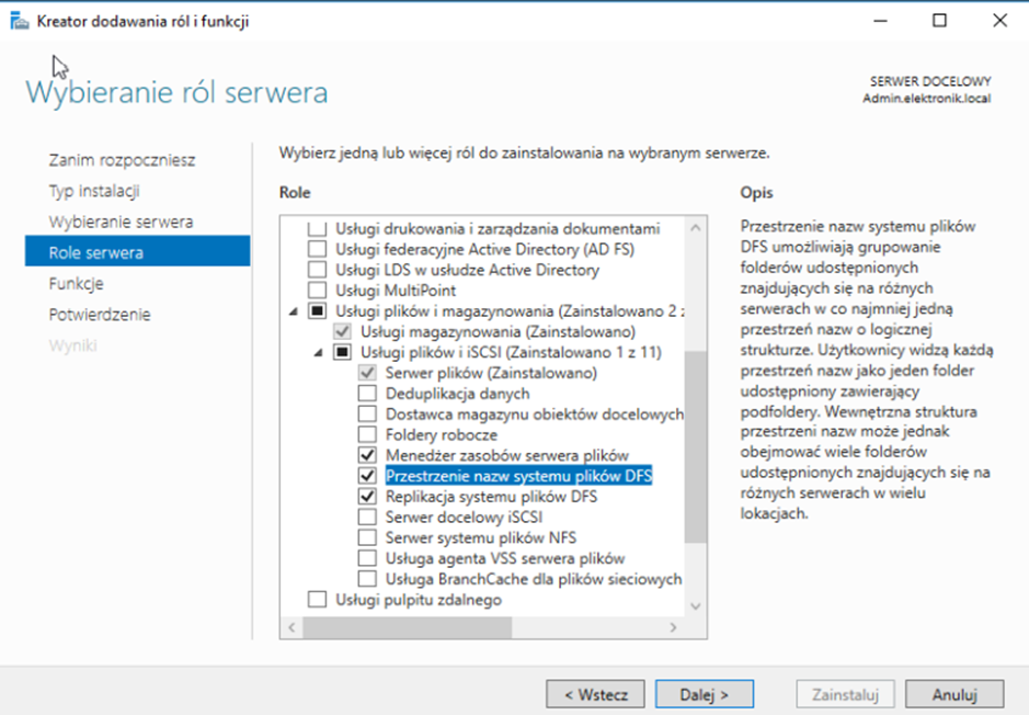 Zaznaczamy „Usługi plików i magazynowania”. Jak już wcześniej wspomniałem, mamy już zainstalowaną tę funkcję, ale musimy jeszcze dorzucić „Menedżer zasobów serwera plików”. Dodatkowo (opcjonalnie) dodajemy dwie opcje związane z funkcją DFS