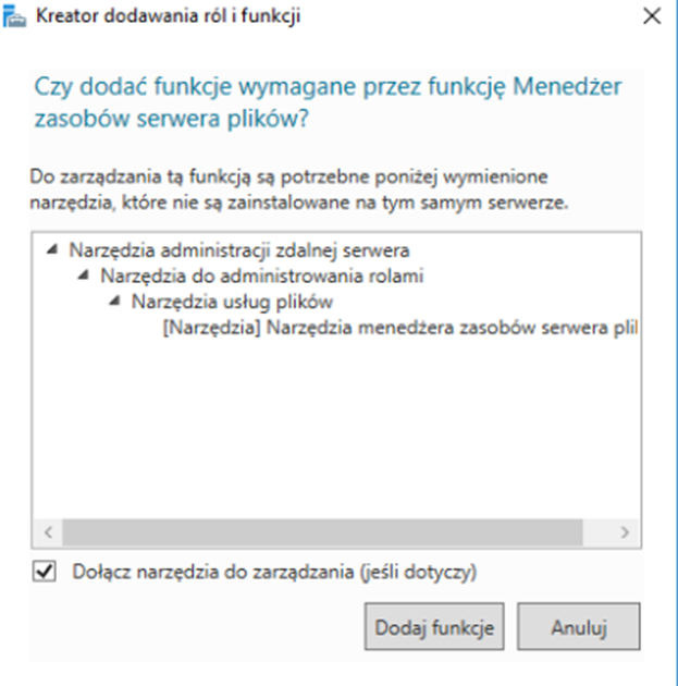 Pojawią nam się podczas zaznaczania dwa okna z informacją jakie funkcje zostaną dołączone do tych ról. Naciskamy „Dodaj funkcje”