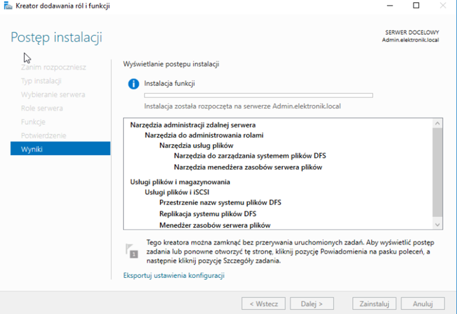 Musimy trochę poczekać aż się rola zainstaluje. Można okno z procesem instalacji „zamknąć”, a u menedżera góry i tak będzie widać, że instalacja nadal trwa. Po zainstalowaniu usługi klikamy „Zamknij”