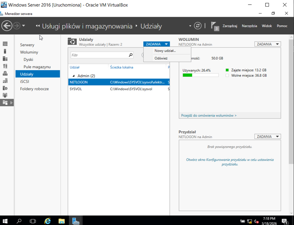 Z „Menedżera serwera” wybieramy teraz „Usługi plików i magazynowania”, a następnie zaznaczamy „Udziały” i z menu „Zadania” wybieramy „Nowy udział”