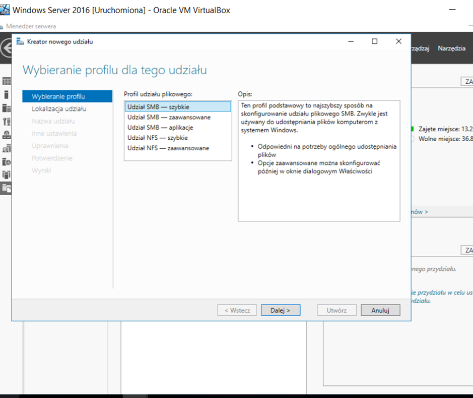 Uruchamia się „Kreator nowego udziału” i wybieramy najprostszy sposób udostępniania zasobów, czyli protokół SMB w wersji „szybki” i naciskamy „Dalej”