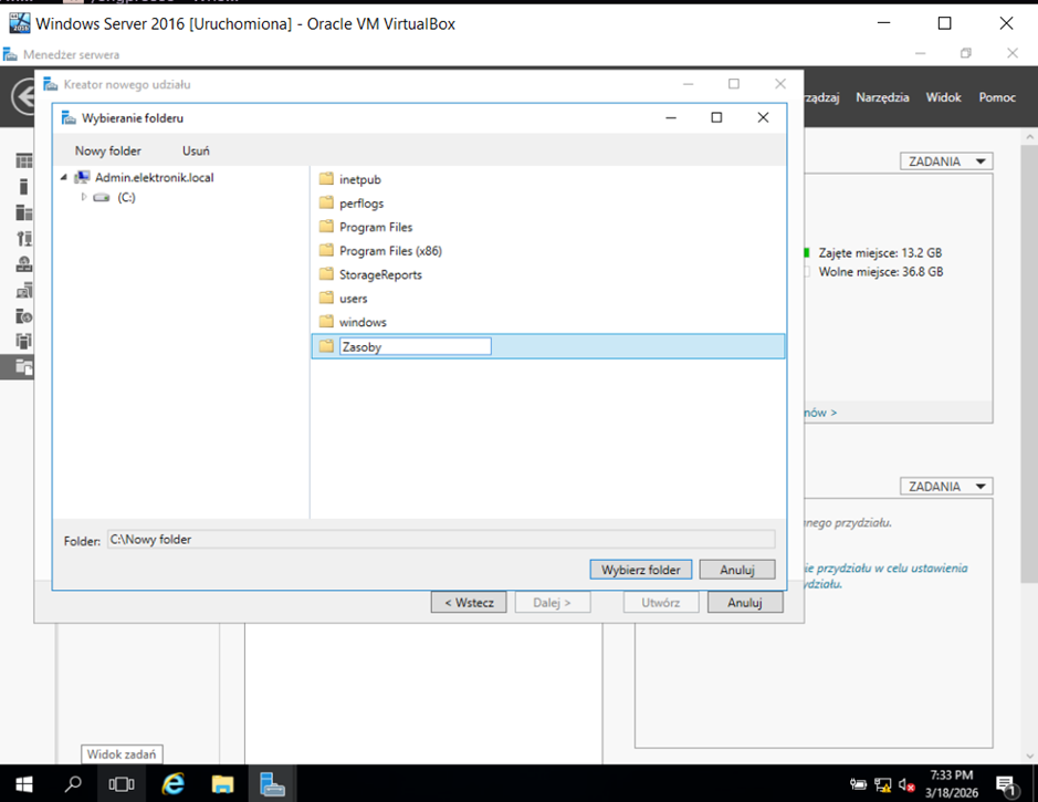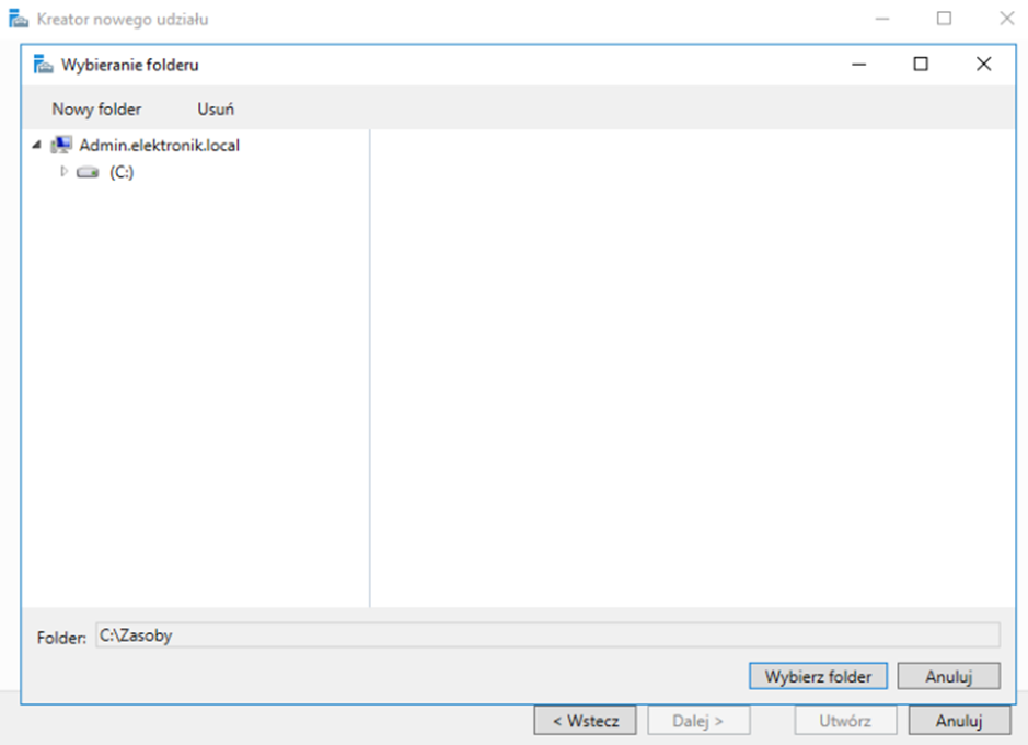 Wybieramy „Nowy folder”, podajemy jego nazwę (u nas Zasoby) i naciskamy „Wybierz folder”
