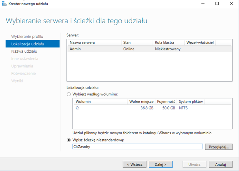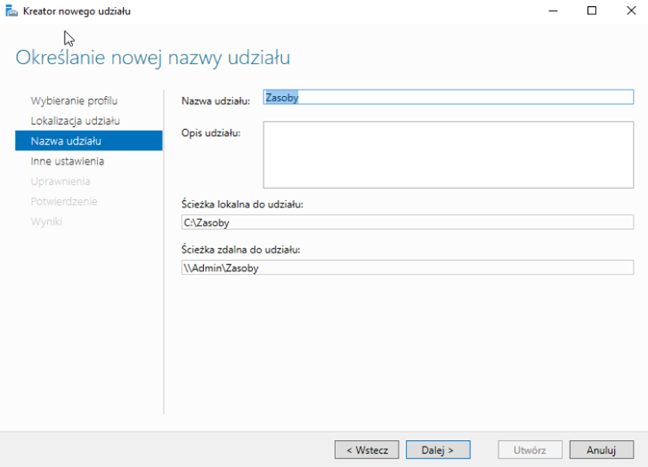 Następnie podajemy jakąś nazwę, pod którą nasz folder będzie widoczny w sieci lub pozostawiamy tę zgodną z jego właściwą nazwą na serwerze. Możemy także dorzucić jakiś opis. Zwracamy uwagę na ścieżkę zdalną do udziału, z której będziemy korzystać i naciskamy „Dalej”