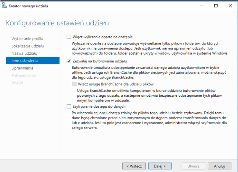 W kolejnym kroku możemy włączyć np. ukrywanie zasobów niedostępnych dla danego użytkownika (1 opcja) lub dostęp do plików w trybie offline lub jeszcze szyfrowanie. My zaznaczamy opcję drugą i naciskamy „Dalej”
