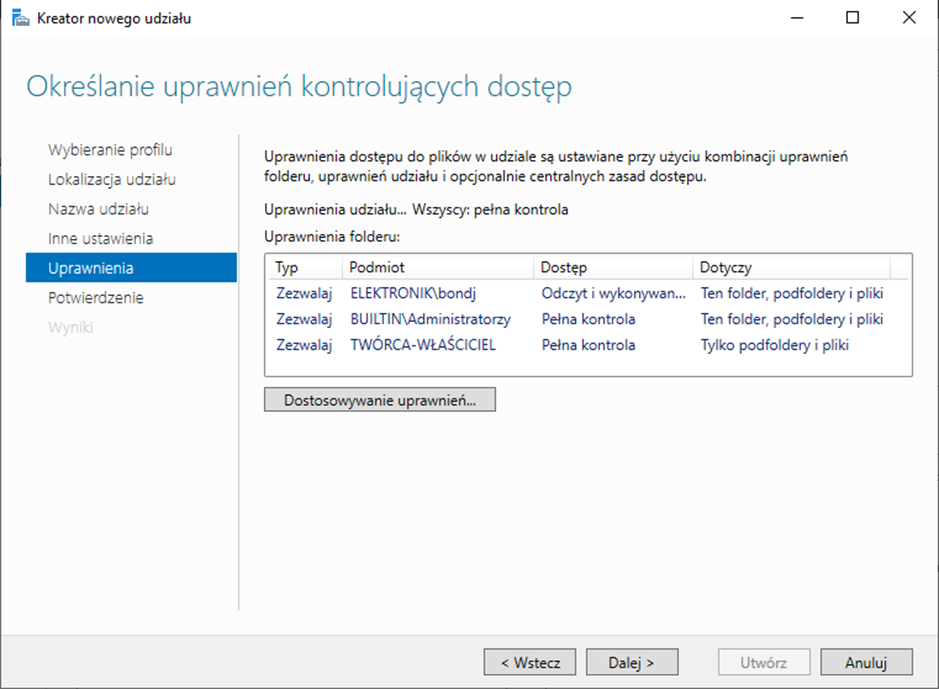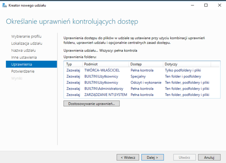 W kolejnym oknie możemy określić uprawnienia kontrolujące dostęp. Klikamy więc „Dostosowywanie uprawnień”