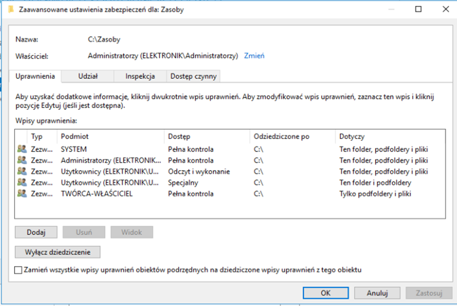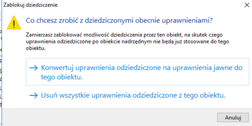 A następnie wyłączymy dziedziczenie, klikając w opcję „Wyłącz dziedziczenie”