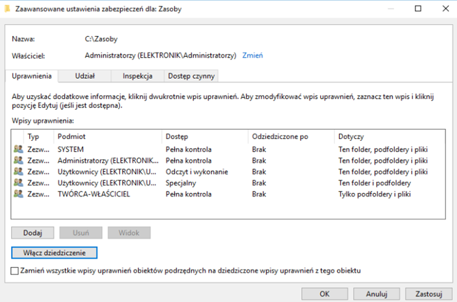 Następnie usuwamy zbędne wpisy, pozostawiając tylko właściciela oraz grupę Administratorzy. Teraz możemy określić kto oprócz nich ma mieć dostęp do tego folderu. Naciskamy więc „Dodaj”