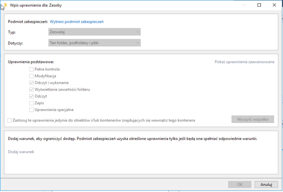 Uprawnienia te będą dotyczyć tego folderu, podfolderów i plików. Jeśli mamy powyższe uprawnienia to naciskamy „OK”