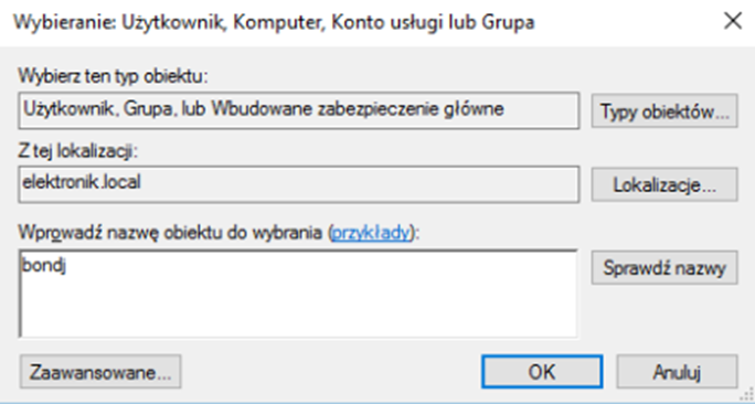 I podajemy użytkownika (lub grupę), któremu chcemy nadać dostęp do naszego folderu. U nas będzie to bondj. Najpierw wpisujemy go, a potem sprawdzamy czy taki użytkownik znajduje się w AD. Jeśli tak to klikamy „OK”