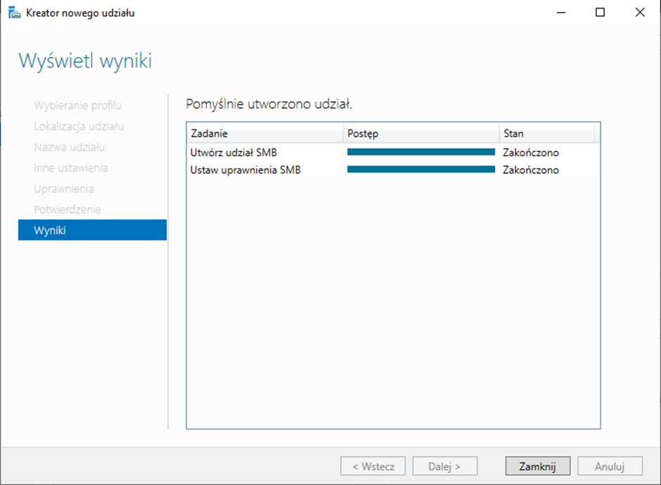 Mamy potwierdzenie utworzenia udziału i klikamy „Zamknij”