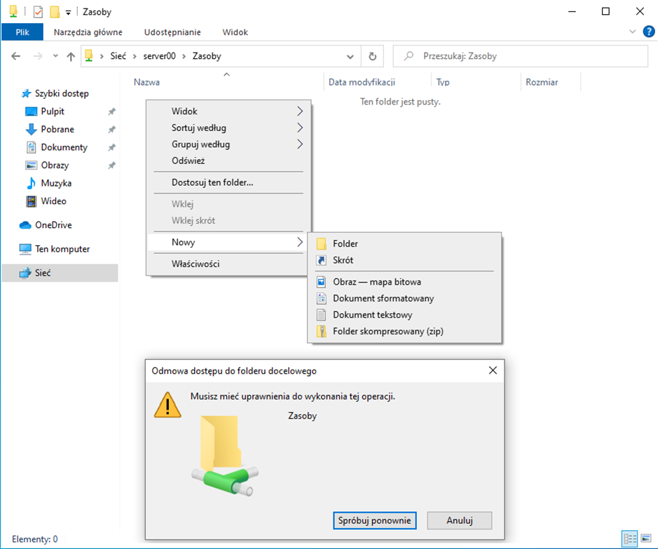 Następnie przechodzimy do folderu Zasoby i sprawdzamy czy działają uprawnienia. Widzimy, że przy próbie dodania pliku uzyskujemy odmowę dostępu, czyli wszystko jest OK