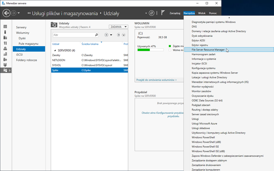 Teraz utworzymy swój własny przydział (np. 1,5 GB). Mając uruchomiony „Menedżer serwera” z „Narzędzi” wybieramy przystawkę „File Server Resource Manager”