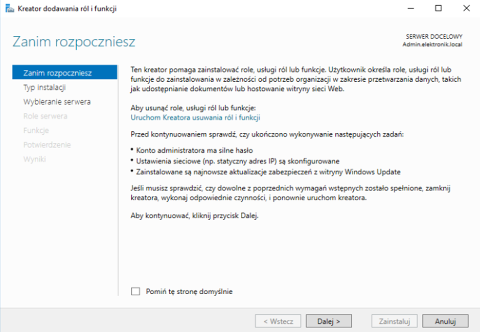Uruchamia się „Kreator dodawania ról i funkcji” – naciskamy „Dalej”