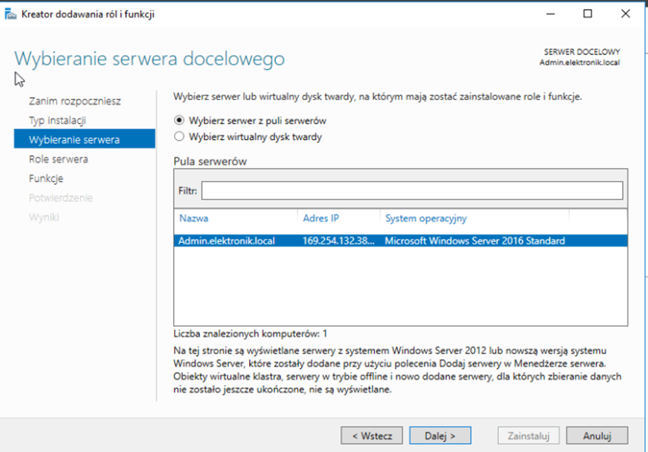 Wybieramy nasz serwer (innego nie mamy) i naciskamy „Dalej”