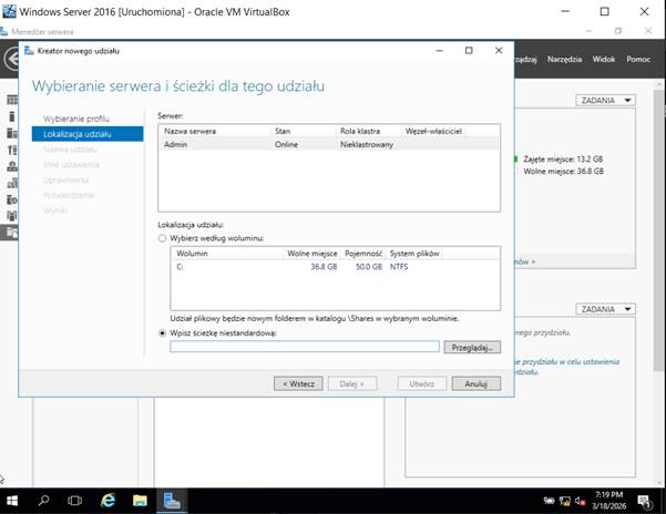 I widzimy w „Menedżerze serwera”, że nasz folder jest już udostępnionym udziałem sieciowym. Jest to proste udostępnienie, bez np. określonego przydziału dyskowego (limitu)
